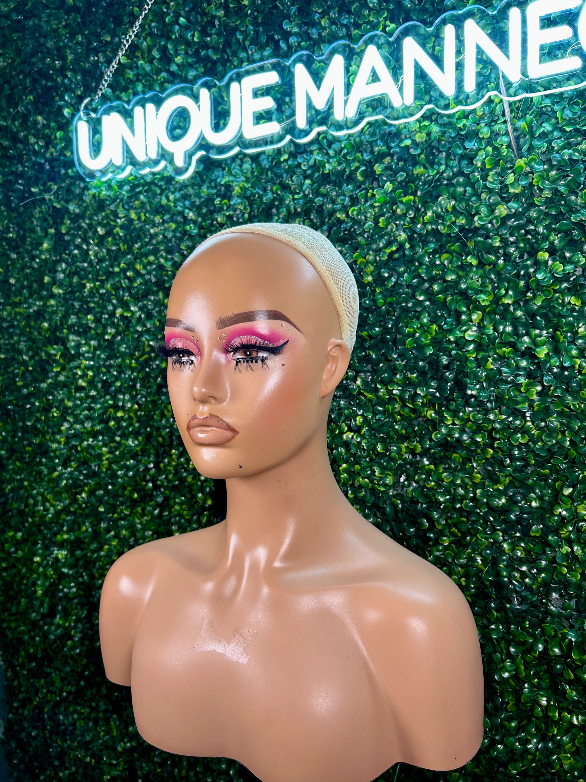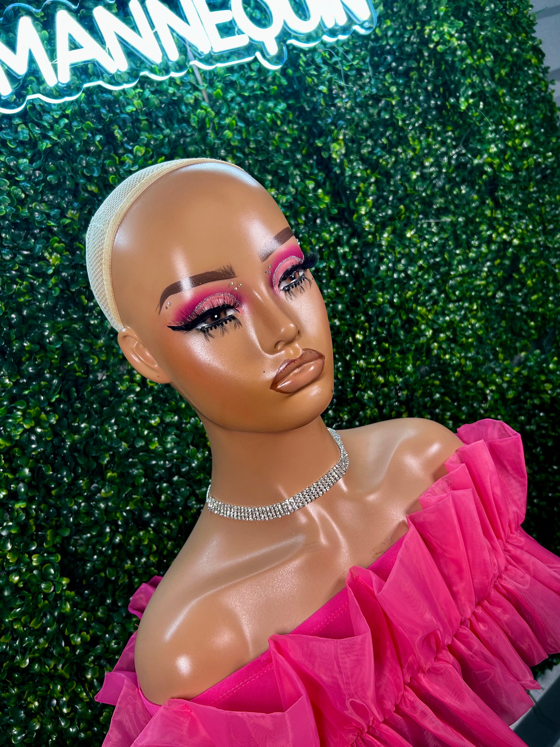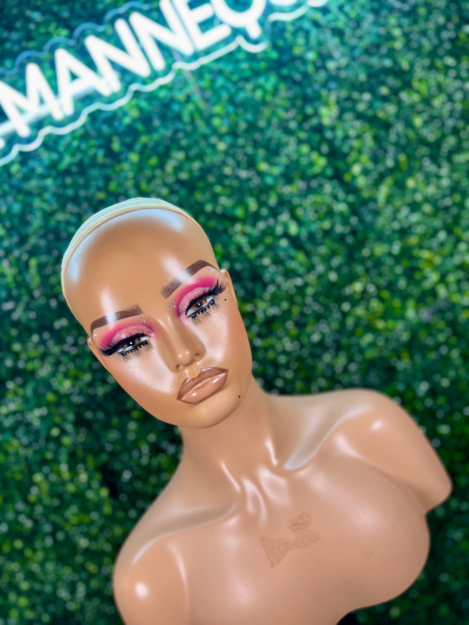 Jerry is a handcrafted mannequin with a bold glam makeup look and a medium/fair skin tone.