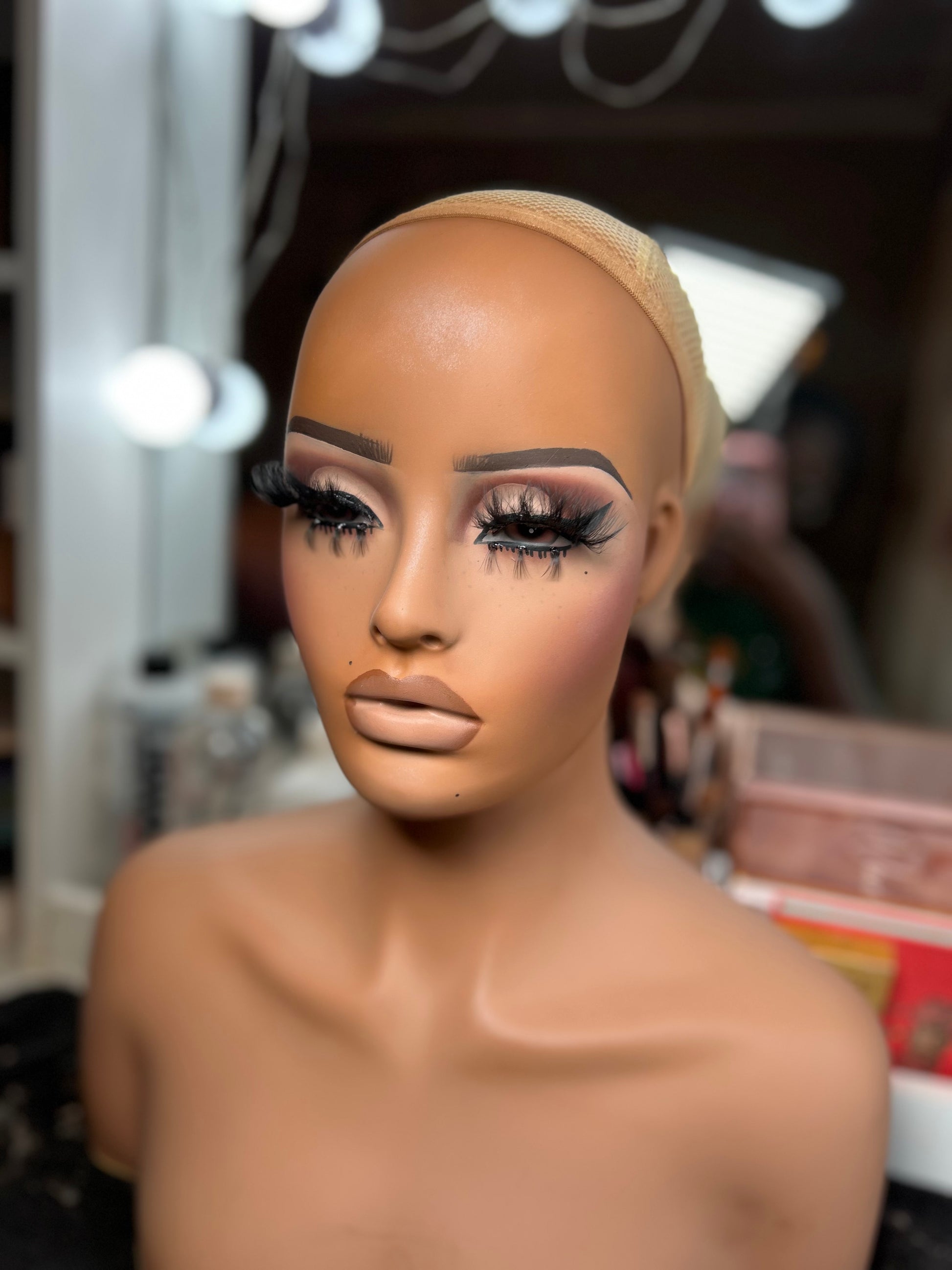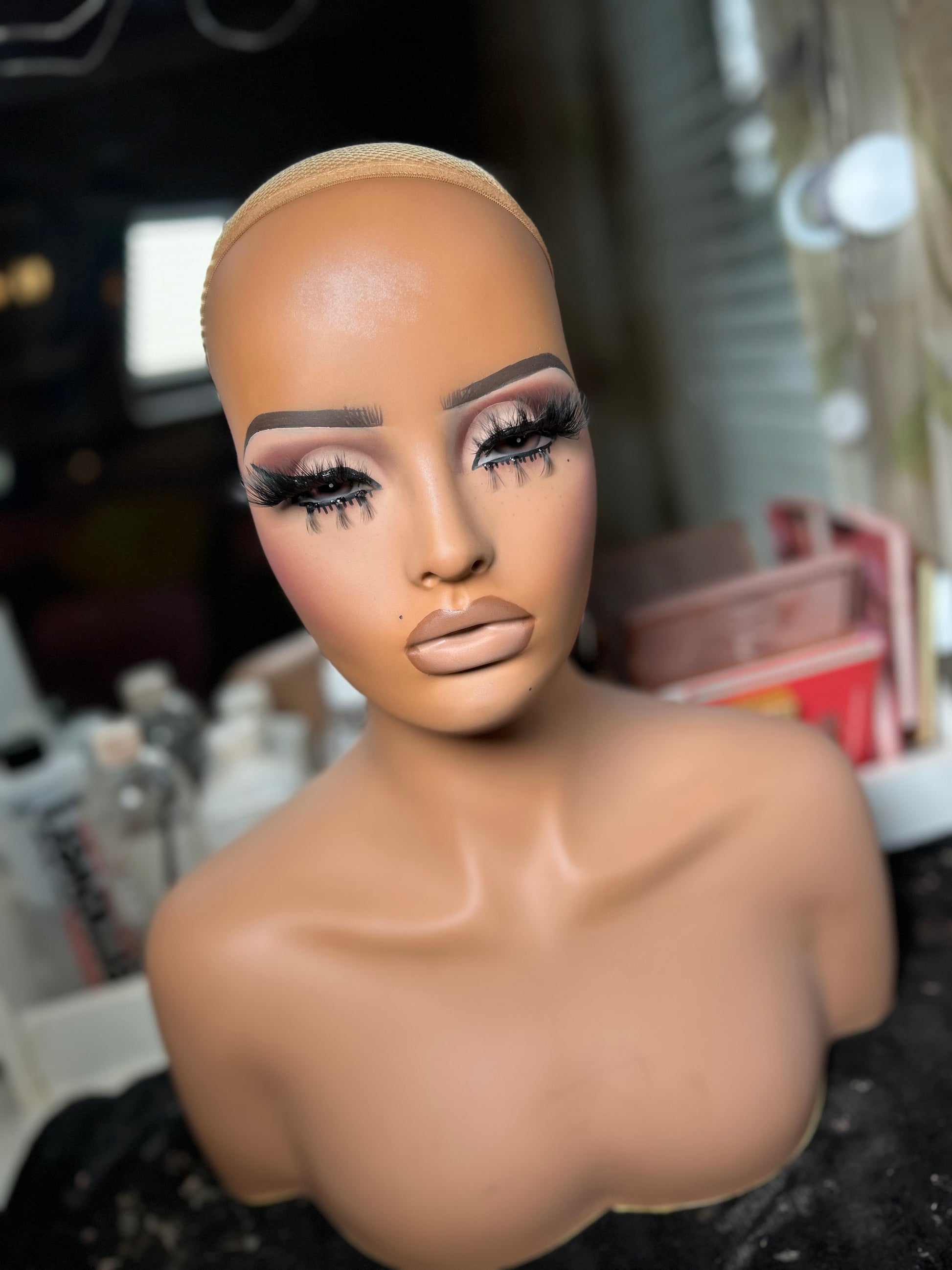 Makayla is a handcrafted mannequin with a natural glam makeup look and a medium/fair skin tone.