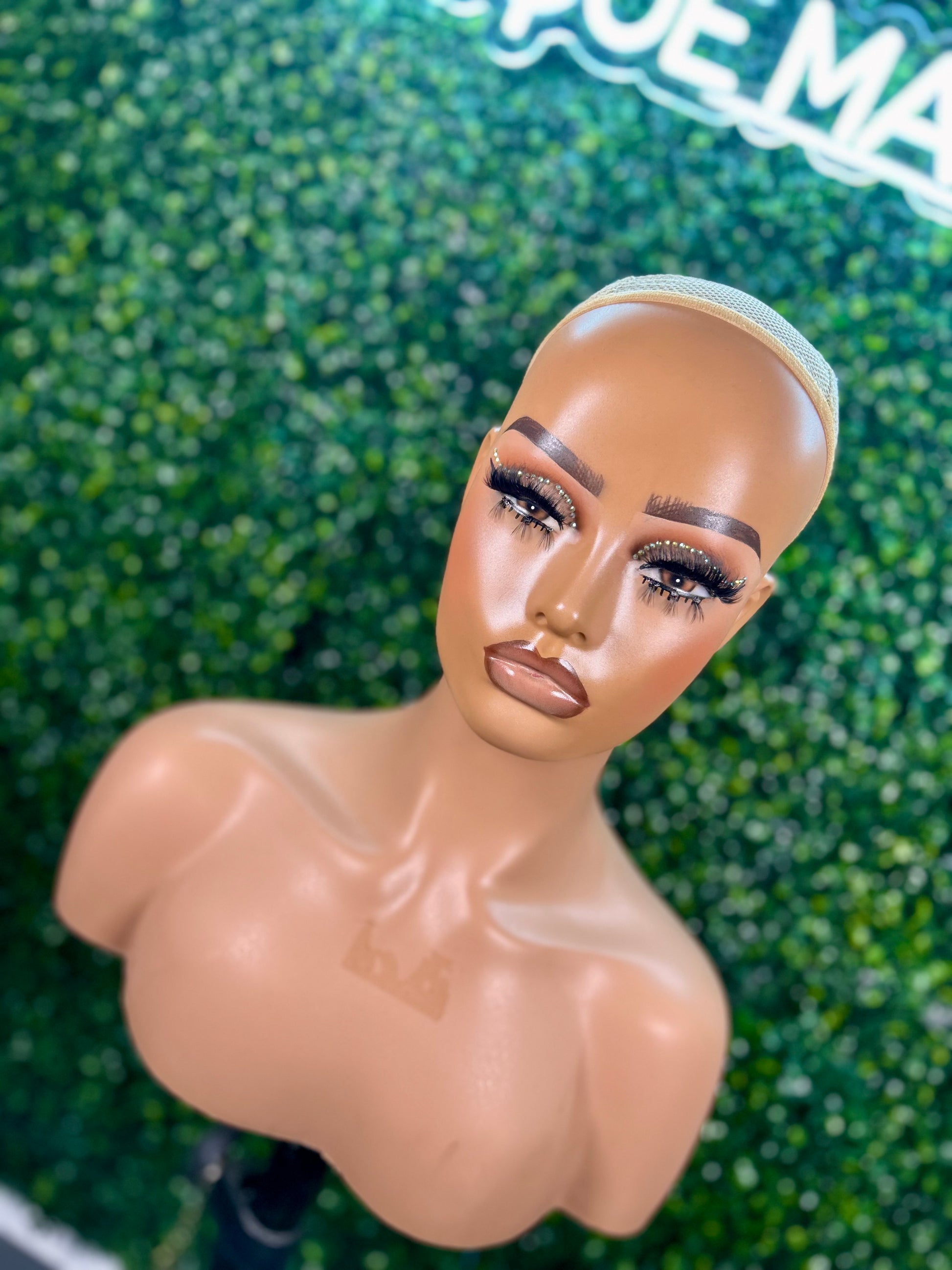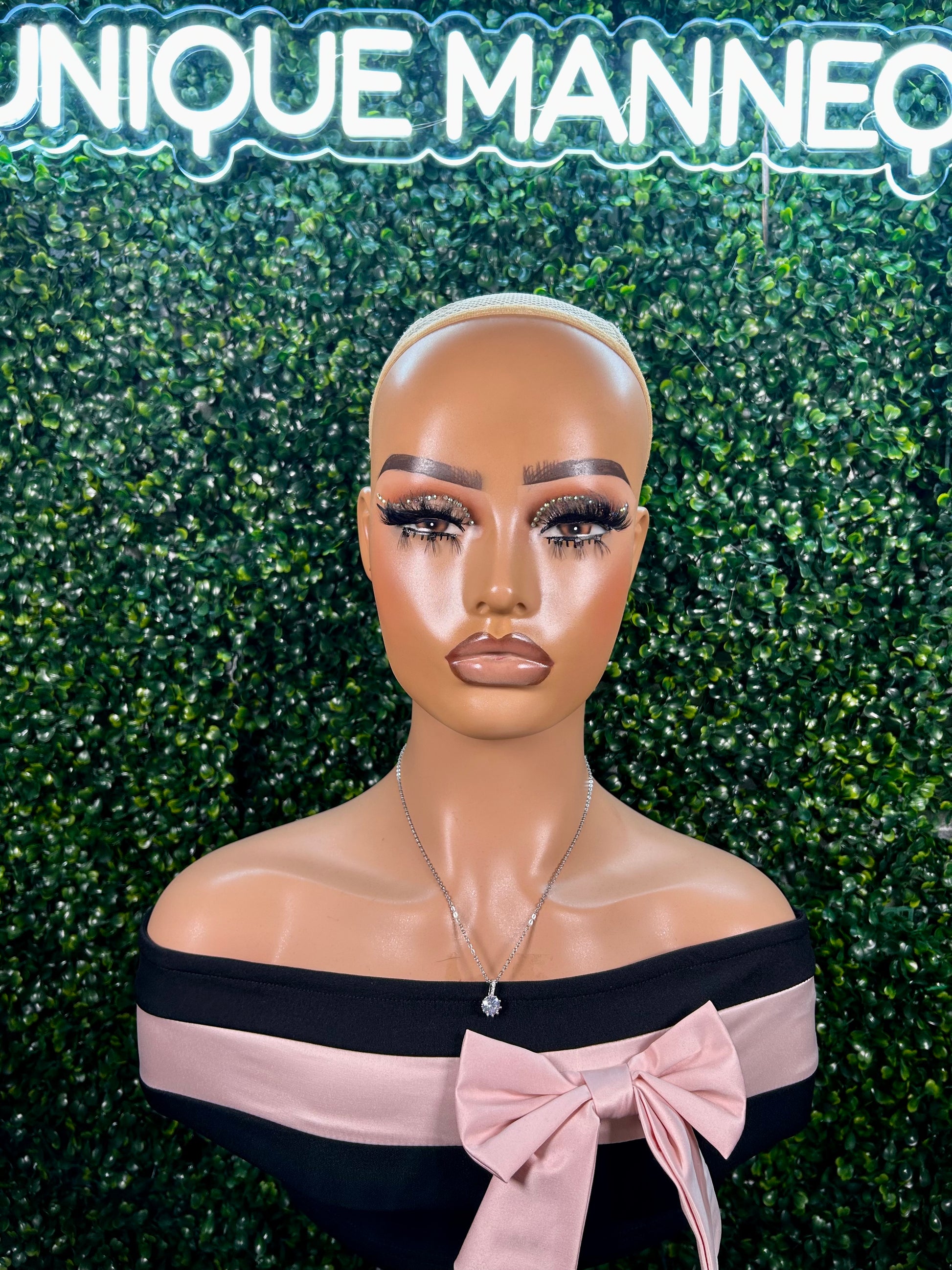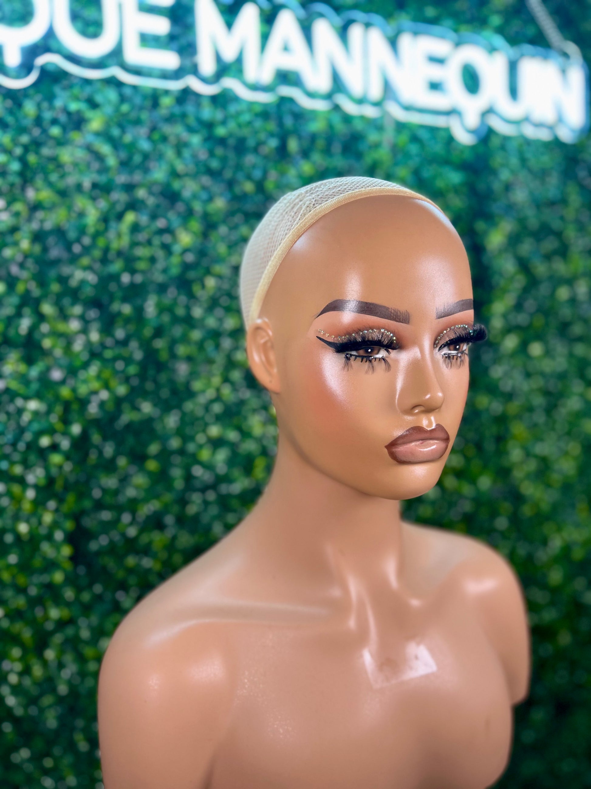 Sinai is a handcrafted mannequin with a natural glam makeup look and a medium/fair skin tone.